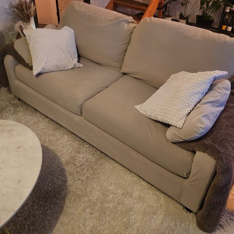Mått enligt specifikation: sittbredd ca 70 cm per plats, sittdjup ca 58 cm, sitthöjd ca 48 cm, totaldjup ca 95 cm och totalhöjd ca 88 cm. Benens höjd är ca 18 cm, vilket ger utrymme under soffan för städning. Passar som tvåsitssoffa i vardagsrum eller mindre utrymmen.