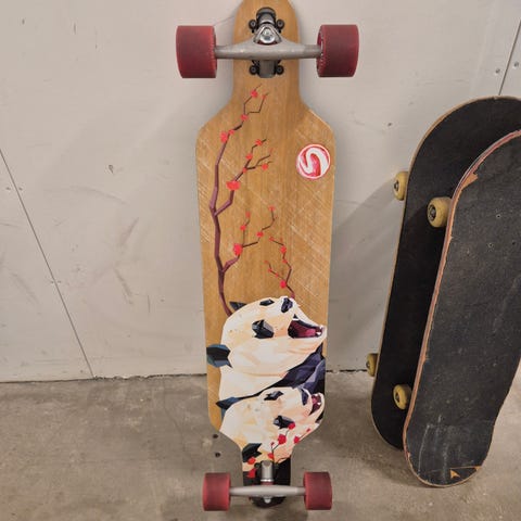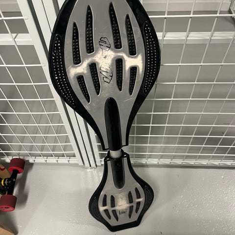 Ripstik waveboard i röd och svart färg. Brädan har två plattformar med vridbar mittdel och hjul undertill för åkning på hårt underlag.