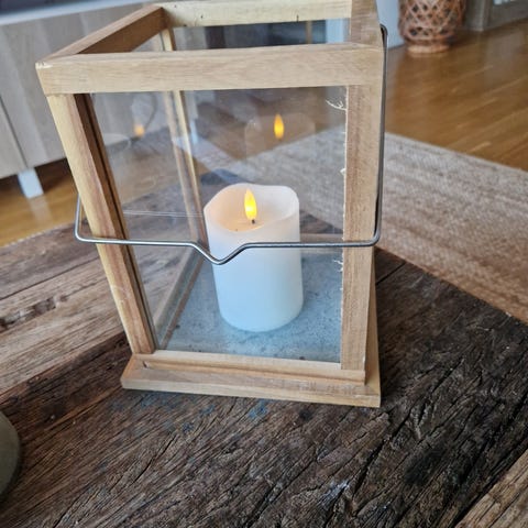 Jag hade den på altanen (ej inglasad) en säsong, därav rosten. Men det gör den ännu snyggare, tycker jag. Ha levande ljus eller batteridrivet,