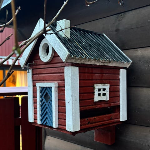 Det har en avtagbar topp så man kan fylla på fågelfrön för matning av fåglar, eller göra om innuti så fåglarna kan bo.