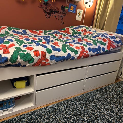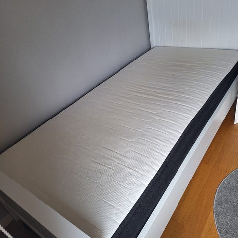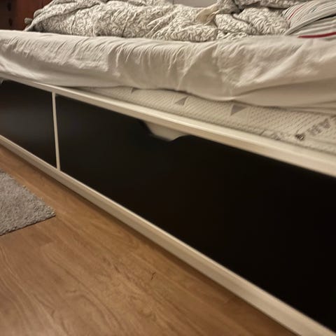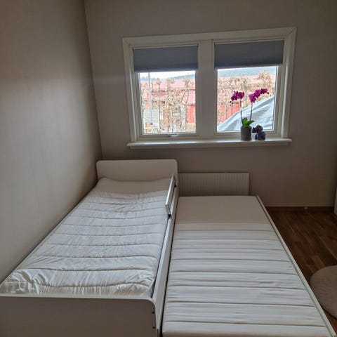 IKEA säng med utdragssäng i vit färg. Sängen består av en huvudsäng med ribbotten samt en utdragbar extrasäng under, även den med ribbotten. Konstruktionen är i trä/träfiberskiva med vit yta. Passar som enkelsäng till vardags och kan användas som dubbelsäng eller två separata sängar vid behov. Lämplig för sovrum, gästrum eller barnrum. Madrasser ingår och är fräscha med nytvättade madrasskydd.