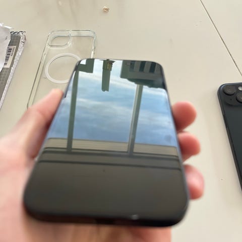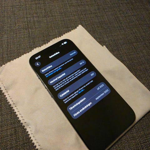 Apple iPhone 15 Pro smartphone med 128 GB lagringsutrymme. Modellen har trippelkamera på baksidan och en skärm som täcker nästan hela framsidan. Batterihälsa 88%. Fungerar som den ska