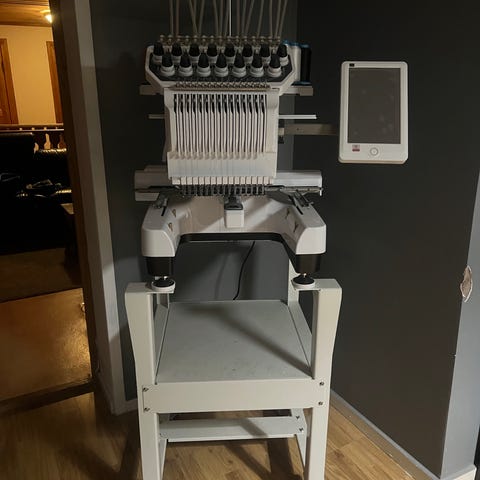 Texi computerized embroidery machine med fristående stativ. Maskinen är datorstyrd och avsedd för brodering på textilier. Den har flera trådspolar och nålar för flerfärgsbroderi samt ett integrerat kontrollsystem via pekskärm. Maskinen är monterad på ett stabilt golvstativ med hylla för tillbehör och tråd. Lämplig för produktion av broderier på exempelvis kläder, kepsar och andra textilprodukter i mindre studio eller verkstad.extra tillbehör ingår