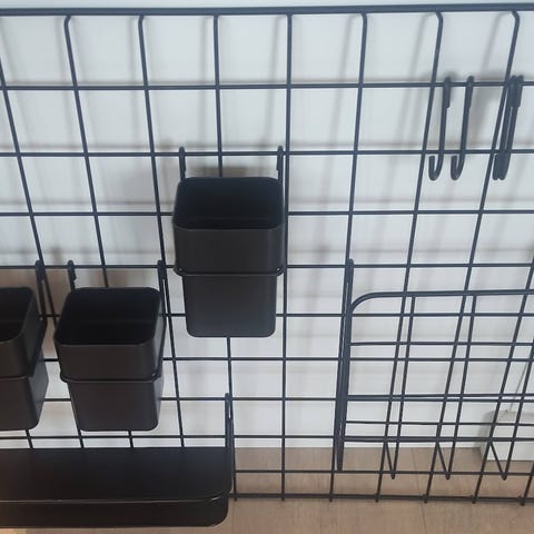 Vägghylla i svart metall med perforerad korg och sju krokar undertill. Perfekt för förvaring i kök, hall eller badrum. Köpt hos Clas Ohlson