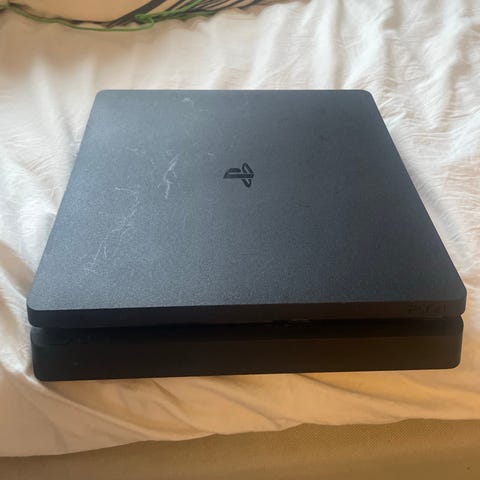 Sony Playstation 4 spelkonsol med tillhörande kablar förutom HDMI kabel, en trådlös handkontroll i kamouflagefärg och flera PS4‑spel som Minecraft, FIFA 17, Tom Clancy’s Rainbow Six Siege, Horizon Zero Dawn, Watch Dogs 2, Call of Duty: Infinite Warfare, Overwatch och Uncharted 4: A Thief’s End.