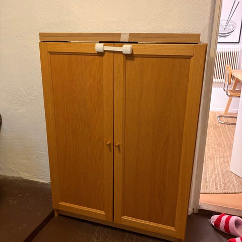 Ett skåp av massiv trä med en dörr och två hyllplan. Skåpet står på fyra, justerbara ben.