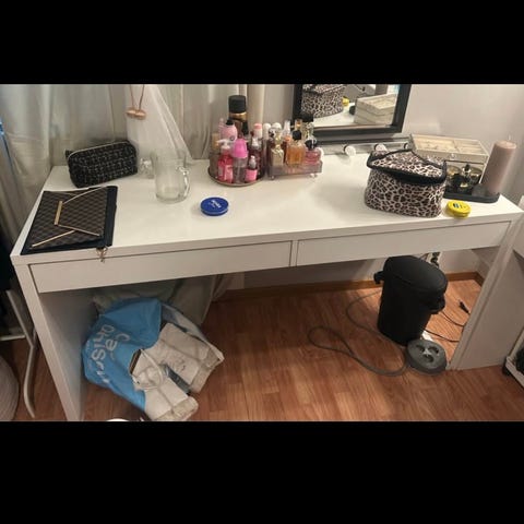 Skrivbordet är stabilt och i bra begagnat skick. Gott om plats för dator, skärm och annat du behöver ha på skrivbordet.