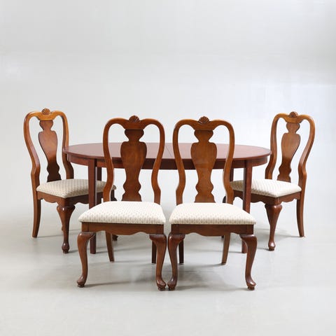 Stolarna är stabila och gedigna, och behöver endast ny klädsel om man vill fräscha upp dem.