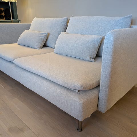 Hej, har flyttat till ny bostad och inser att den tilltänkta 3 sits soffan dessvärre inte får plats med det nya möblemanget. V-rummet är kortare än beräknat.