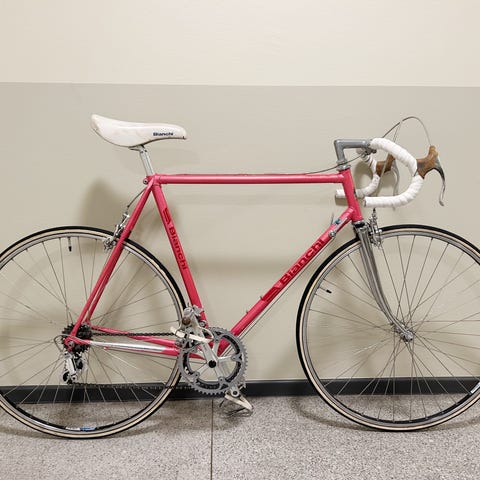 Ikonisk cykel i Bianchi’s typiska celeste-gröna färg. Köptes av en samlare för några år sedan. Originaldelar rakt igenom (campagnolo bl a). Har körts fint många fina mil men står nu och samlar damm. Behöver lite kärlek för att bli körduglig igen.