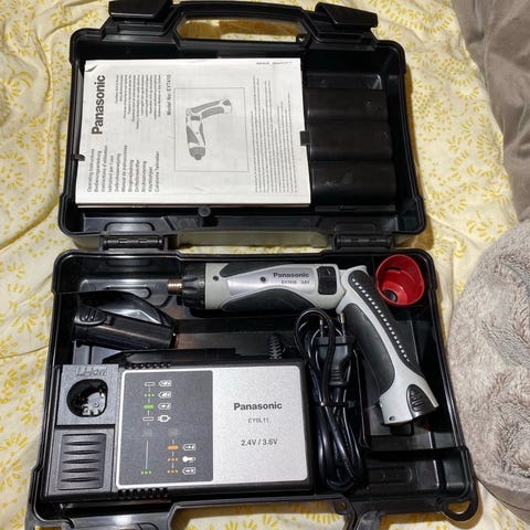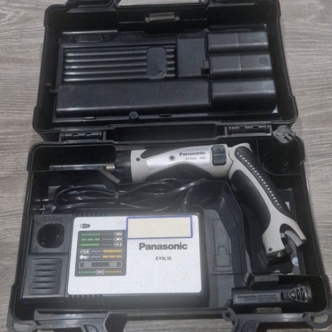 Panasonic EY6220 skruvdragare med tillhörande laddare och plastväska. Skruvdragaren är en kompakt modell med pistolgrepp och justerbart moment. I kitet ingår skruvdragare, nätdriven laddare och hård plastväska för förvaring och transport. Passar för enklare skruv- och monteringsarbeten i hemmet eller verkstaden. Bruksanvisning medföljer enligt bilder.