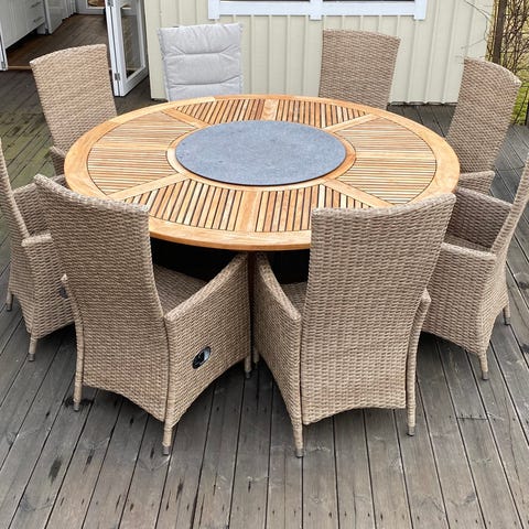 Sommarmöbler loungeset 3-sitsgrupp i teak med dynor. Gruppen består av soffa och fåtölj med sitt- och ryggdynor samt ett bord på cirka 90 x 90 cm. Träramen är i teak och dynorna är i tyg i en neutral färg. Passar för uteplats, altan eller balkong där man önskar en sittgrupp med bord för avkoppling och umgänge utomhus.