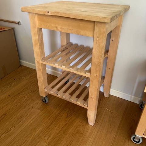 Köksö eller arbetsbänk i trä. Bänken har massiv träskiva och en underhylla med gallerkonstruktion för förvaring. Ovanför underhyllan finns en stång med krokar för upphängning av köksredskap eller andra tillbehör. Passar som extra arbetsyta och förvaring i kök eller hobbyrum.