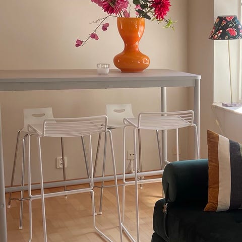 Som andra beskriver den: ”Barstolen från Hay har en minimalistisk, dansk formgivning perfekt för designälskaren. Pallen är tillverkad av svetsat stål med en skyddande, vädertålig utomhusprimer som bara blir vackrare med åren. Den har ett avslappnat uttryck med en luftig, lätt känsla.”