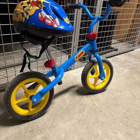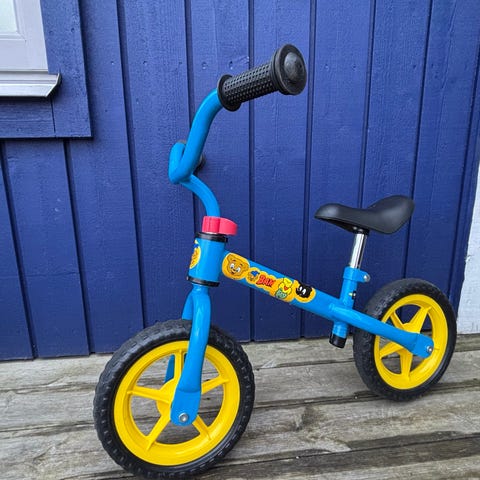 Barn springcykel med 10" hjul i blå och gul färg och Bamsemärken. Cykeln har ram och styre i blått, gula hjul och svart sadel. Utrustad med ringklocka på styret. Passar mindre barn som ska träna balans och förberedelse inför vanlig cykelkörning.