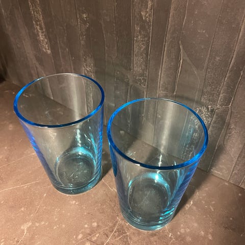 IKEA glas med blått mönster. Klara dricksglas med vertikala blå fält på utsidan. Passar för vatten, juice eller andra kalla drycker i kök eller vardagsrum.
