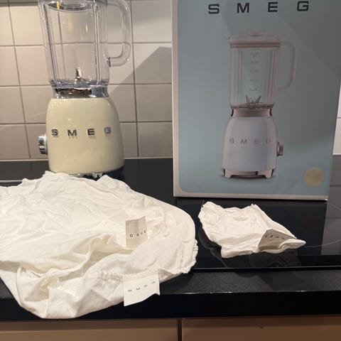Smeg köksmaskin i röd och silver färg. Maskinen är avsedd för blandning och knådning av deg samt andra köksförberedelser. Den har motorhus i rött och fot i silver med fäste för skål och tillbehör. Hastighetsreglage sitter på ovansidan. Passar för användning i hemmakök för bakning och matlagning.