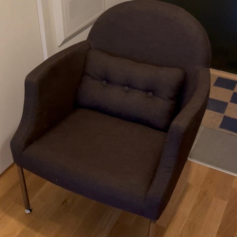 Fin mörkblå fåtölj, designer, välvårdad. Skön och mjuk att sitta i.