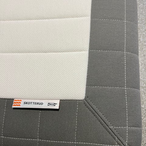 IKEA SKÅRER Säng 90 i vit och beige färg. Madrassen har kviltad ovansida och kant i kontrasterande tyg.