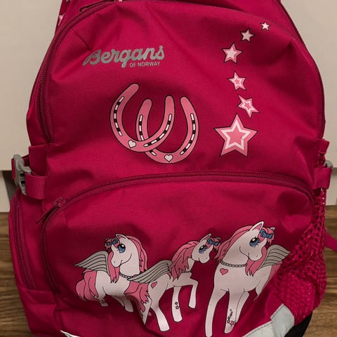 Bergans ryggsäck i vit med blått mönster, passar för barn i längden 125-195 cm. Ryggsäcken är i nyskick, endast använd ett fåtal gånger som mycket praktisk resväska tack vare rymligheten och alla olika fack.