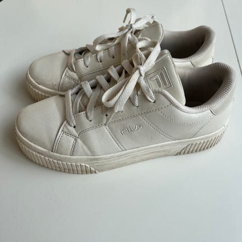 Säljer ett par snygga vita sneakers från FILA i storlek 38,5. Skorna är använda men fortfarande i bra skick och har mycket kvar att ge. Bekväma och passar perfekt till vardags – både till jeans, kjol eller träningskläder.