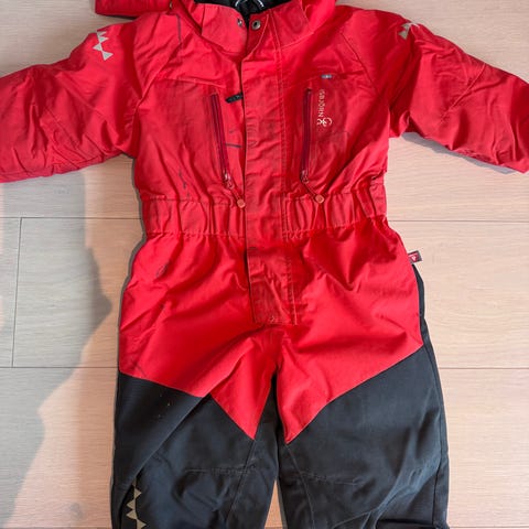 Overall i röd färg med mörka förstärkningar på benens nedre del. Modellen har huva, dragkedja framtill och resår i midja, ärm- och benslut. Yttermaterial i slitstarkt tyg med mjukare foder på insidan.