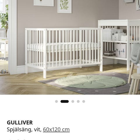 Spjälsäng köpt år 2022 säljes. Sängen har stått i mitt sovrum i cirka 2–3 år men har knappt använts, då mitt barn endast sovit i den vid ett fåtal tillfällen.