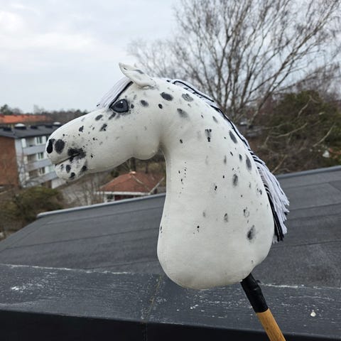 Två käpphästar från Panduro. Vit och svart. Manen är av garn. 100kr st.