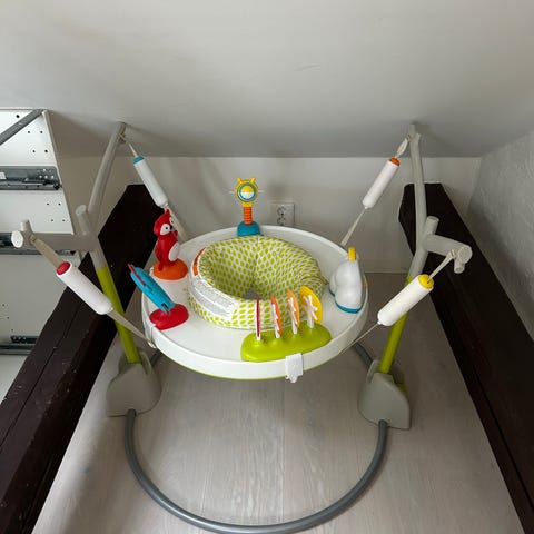 Säljer en hoppgunga som varit kanon och varit väldigt omtyckt. Tyget är tvättbart. Sittdelen är roterbar i 360 grader. Leksakerna går att ta av och flytta runt. Enkelt att rengöra. Går att justera höjden på gungan. Elektroniken i speldosan (räknar hopp, spelar någon låt osv) är helt fungerande. Går att montera ner enkelt och smidigt.