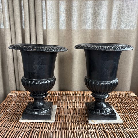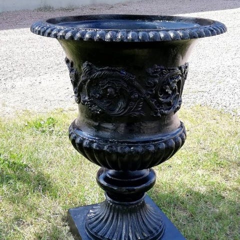 Svart dekorativ urna i gjutjärn.
