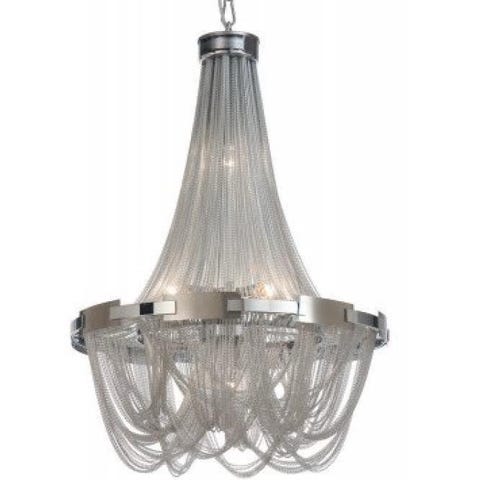 En mäktig takkrona med wow-effekt. Kronan består utav en stål/krom stomme samt långa metallkedjor som bildar formen av en klassisk kristallkrona.