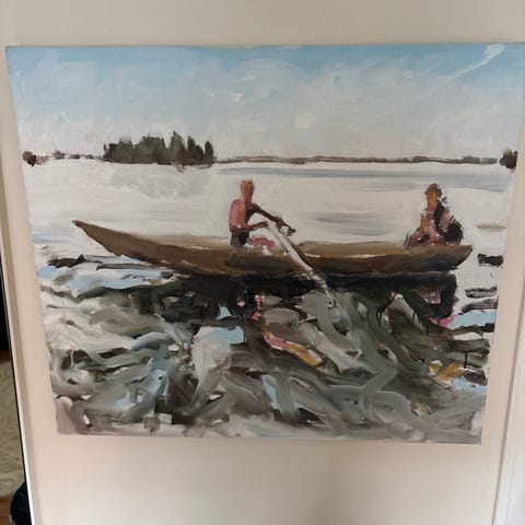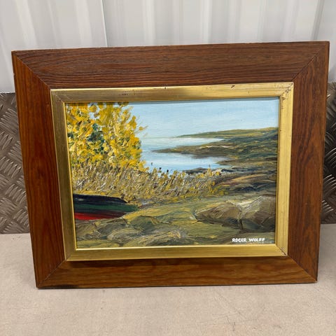 Målad tavla med motiv av en roddbåt i vatten omgiven av natur. Verket är utfört som en oljemålning på duk uppspänd på träram. Baksidan visar signatur och årtal 2024. Passar som väggdekoration i hem eller kontor med natur- eller skärgårdstema. Mått:52x42cm.