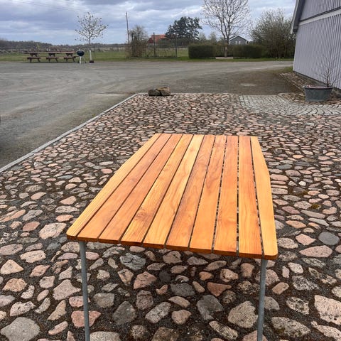 Matgrupp med Bord 9A 100 och fyra Fåtölj A2. Bord och stolar har sits och rygg i ek kombinerat med varmförzinkat stål i stativ och underrede. Passar som matgrupp för ute- eller inomhusbruk beroende på behov och miljö. Designen består av ett runt bord och fyra fåtöljer med armstöd och ribbad sits/rygg i trä.