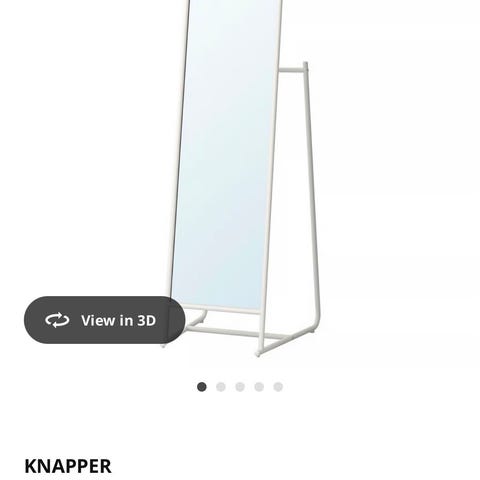 IKEA fristående spegel i vit färg. Spegeln har en smal, rektangulär form med helkroppsspegel på framsidan. Baksidan har stödben som gör att spegeln kan stå fritt på golvet. Passar exempelvis i hall, sovrum eller klädkammare för helkroppsspegling och som praktisk inredningsdetalj.