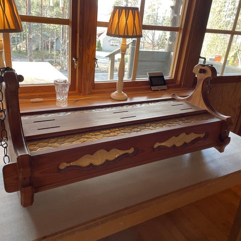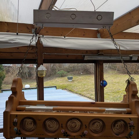 Kökslampa i furu med kedjor och 3 ljuskällor. 36x80 cm