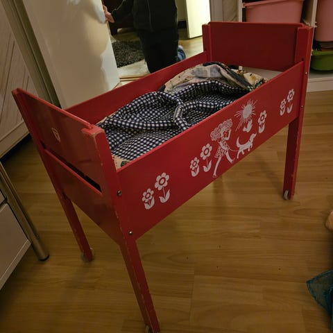 Docksäng. Stol till dockan att sätta på bordet. Babylift till dockan. Stolen SÅLD