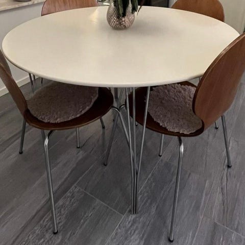 Matbordet är nästan intill nyskick, knappt använd. Däremot förekommer lite lackfällning, men inget som påverkar funktionen.