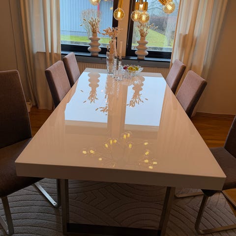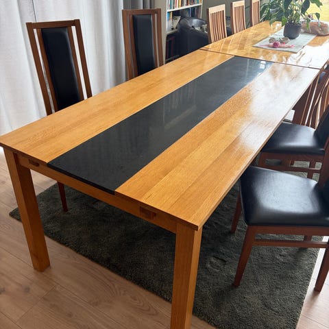 Matbord med 6 stolar i massiv valnöt med granitskiva. Stolarna är även de i valnöt med svart konstläder.