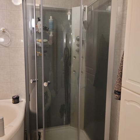 Duschhörna i glas med skjutbara dörrar och handtag i metall. Duschblandare, duschstång och dusch. Passar för installation i hörn i badrum. Gummilister bör bytas ut.