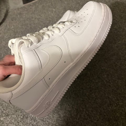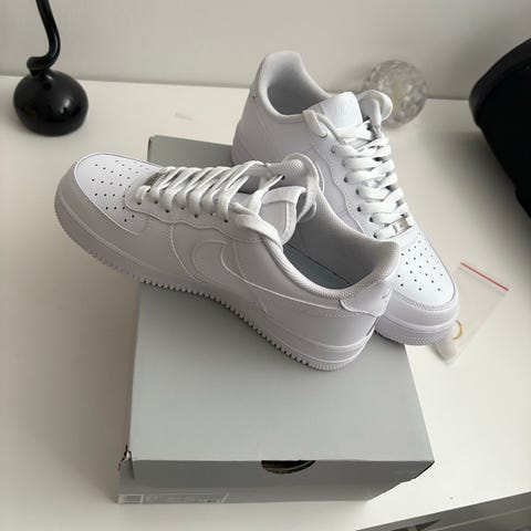 Nike Air Force 1 Low SP sneakers i storlek 44,5. Modellen är låg och har ovandel i vitt material med klassisk Nike‑logotyp på sidorna. Yttersulan är i en ljus, något transparent ton. Skorna har snörning framtill och vadderad krage för ökad komfort. Levereras i originalkartong märkt Nike Air Force 1 Low SP (modellkod CZ8065‑101). Drakes model nocta.