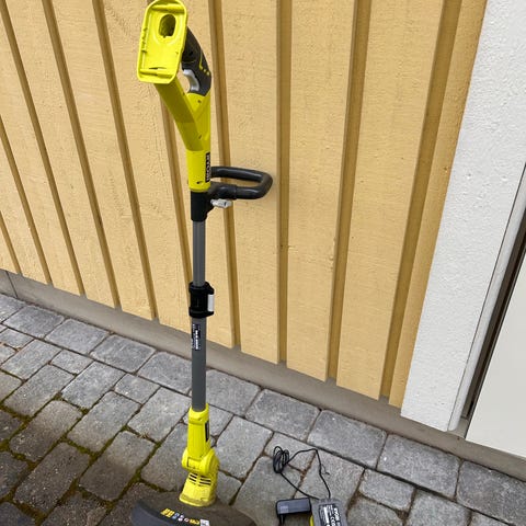 Ryobi grästrimmer i eldriven modell med tvåhandsgrepp och skyddskåpa över trimmerhuvudet. Passar för trimning av gräs och ogräs i trädgård och runt kanter.