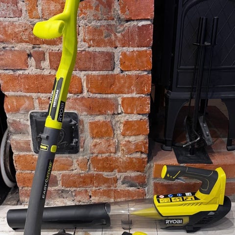 Ryobi grästrimmer och Fiskars isborr med handtag