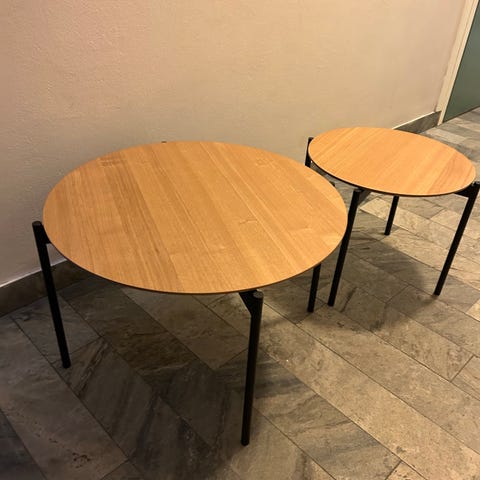 2 soffbord (matchande par ett mindre ett större), det ena kan stuvas under det andra. Det stora bordet mäter 108 cm brett 76 cm djup och 35 cm högt. Det lilla mäter 56 cm brett 35 cm djupt och 30 cm
