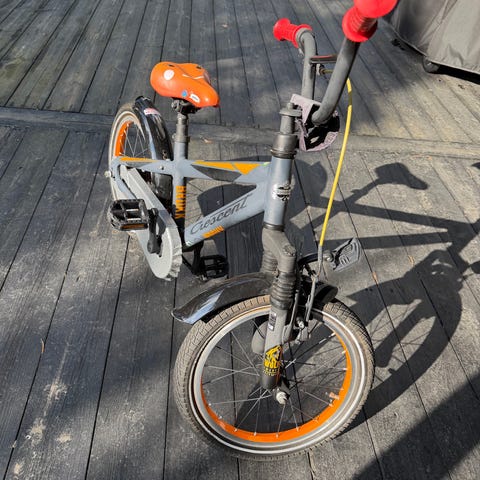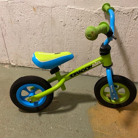 Kayoba barncykel med 12" hjul. Cykeln har blå ram med gröna detaljer, kedjeskydd och stödhjul. Utrustad med sadel och styre anpassade för barn. Passar mindre barn som ska lära sig cykla eller använda cykeln till kortare turer.