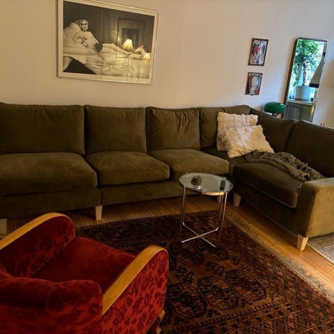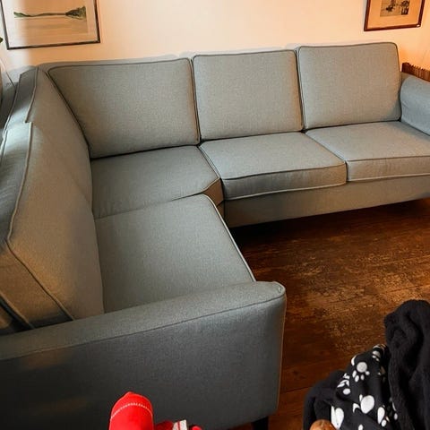 Kuddarna är nyligen tvättade och soffan är fräsch utan synliga fläckar. Den består av tre löstagbara moduler som enligt oss är smidiga att transportera vid hämtning. Modulerna sitter i en fast konfiguration och går inte att ändra ordning på.