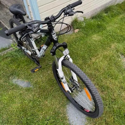 Barncykel med 24" hjul i svart färg. Cykeln har framgaffel med dämpning, handbromsar och växlar. Utrustad med stänkskärm bak, reflexer och sadel i ljus färg med mönster. Passar barn som vuxit ur mindre barncykel och behöver en större modell för vardagscykling och enklare turer.