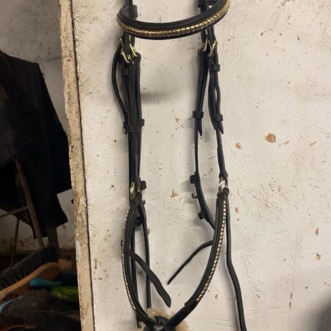 Träns med silver dekor. Dubbel nosgrimma. Strl cob. Bra kvalitet. Inte helt nytt men felfritt och fint. Svart.