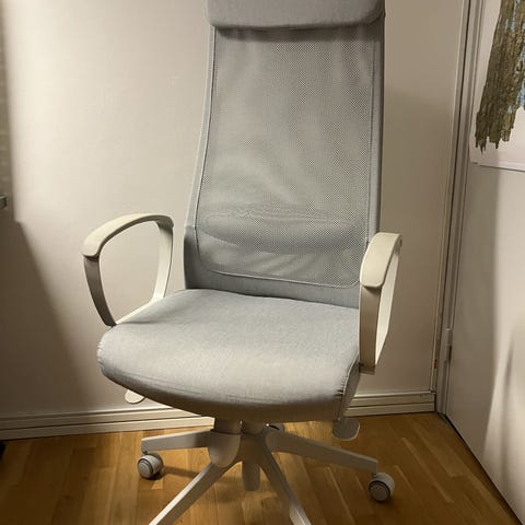 Kontorsstol med hög rygg och justerbart nackstöd. Stolen har vit ram, grå sits och rygg i mesh-tyg. Ben i metall, svarta hjul.