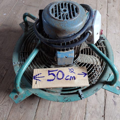 Gammal fläkt som suttit i ladan med elmotor på. Vet ej om den funkar. 80cm i diameter.