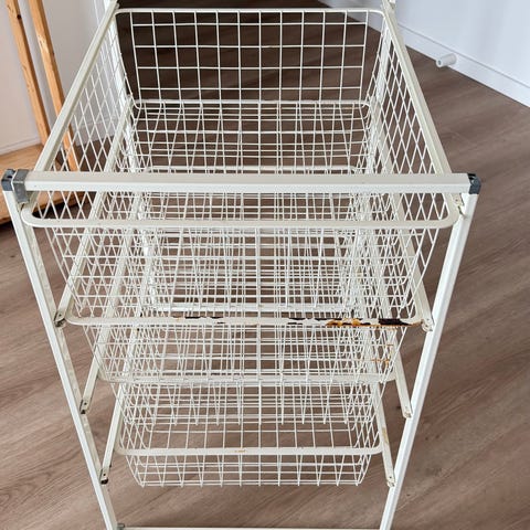 IKEA Antonius förvaringsställ med trådkorgar i vit metall. Stället består av en fristående ram med flera utdragbara trådkorgar som ger överskådlig förvaring. Passar till exempel i garderob, förråd, tvättstuga eller klädkammare för förvaring av kläder, textilier eller andra hushållsartiklar. Konstruktionen är öppen vilket gör det lätt att se innehållet i varje korg och ger god ventilation.